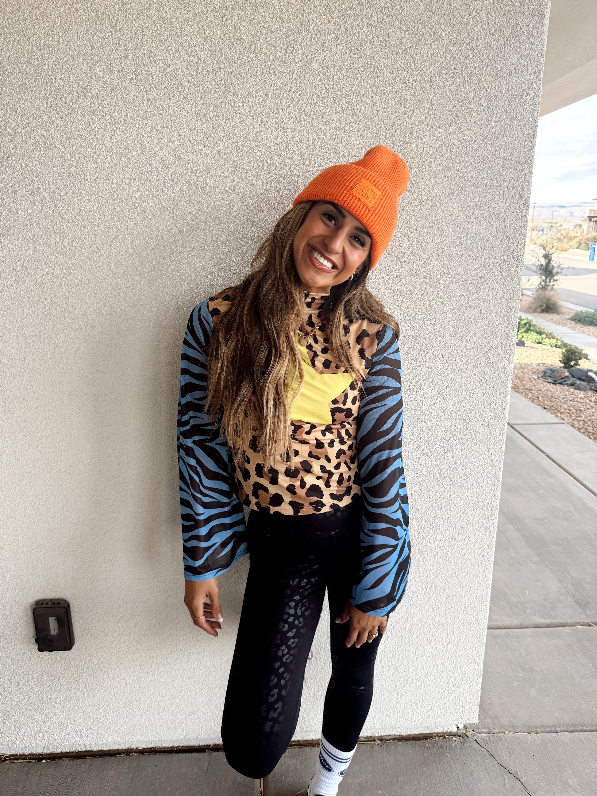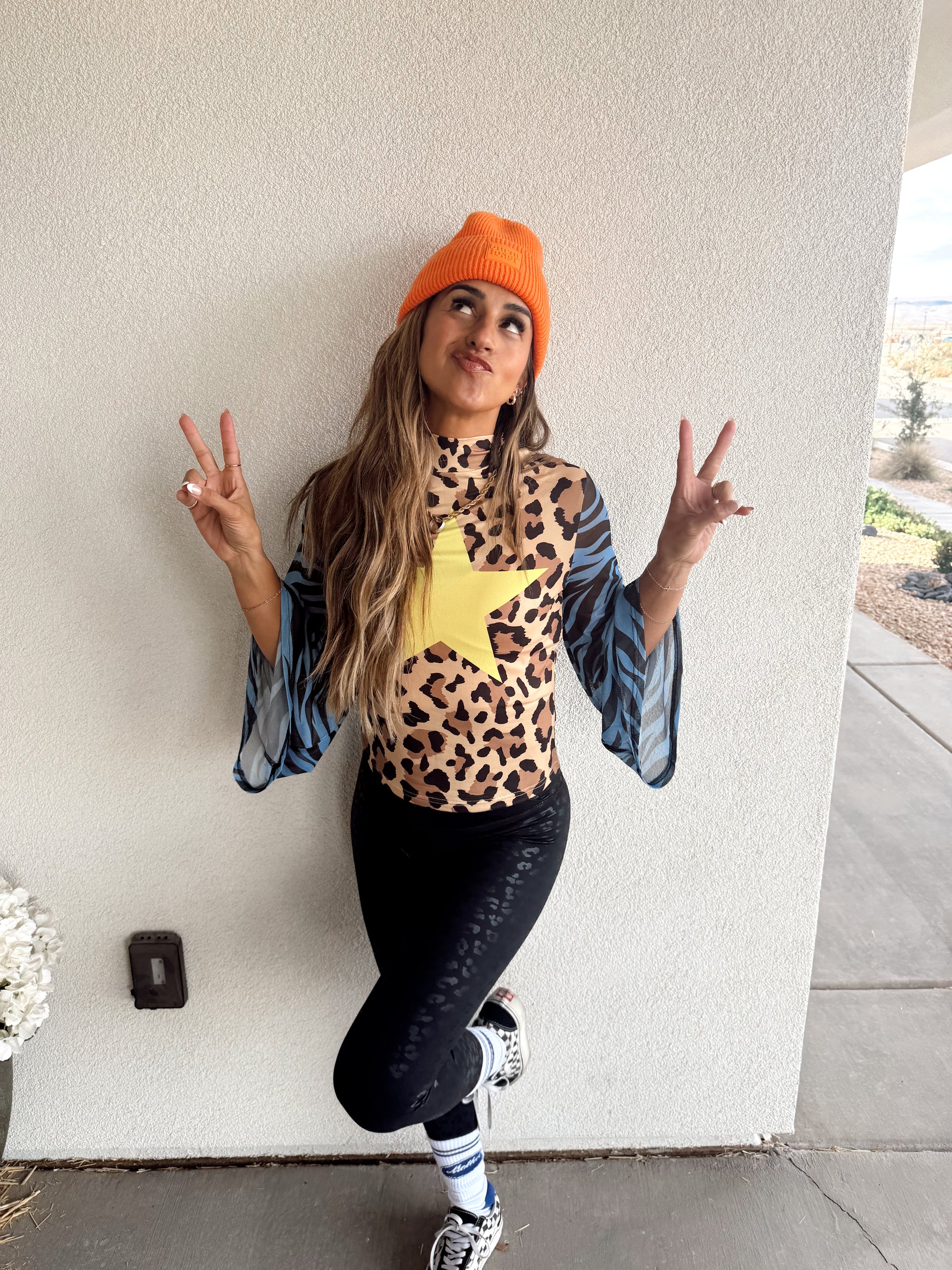 This top does all the talking. A bold mashup of leopard print, blue zebra mesh bell sleeves, and a giant yellow star front graphic. The back says it loud with "DON'T TELL ME WHAT TO DO" in bright yellow block letters.