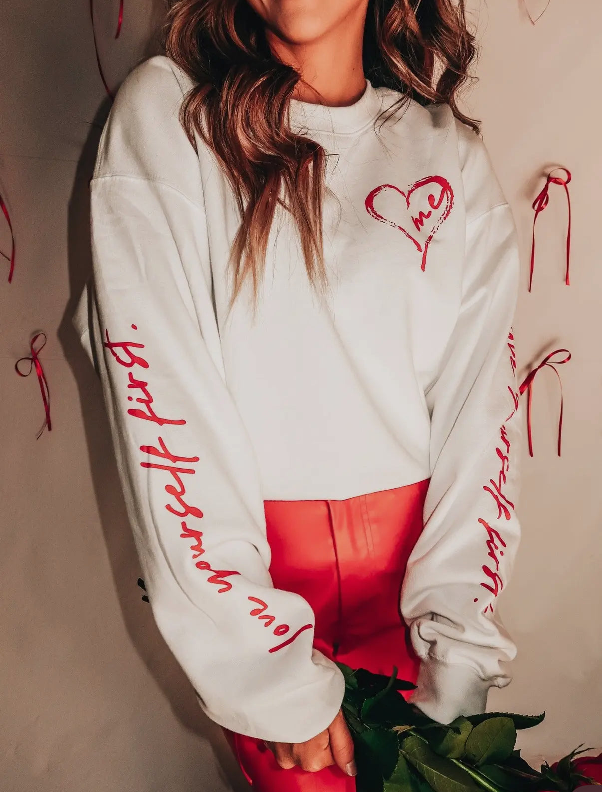 Love ME - Love Yourself First. Throwing out all the self love vibes here! White fleece sweatshirt with the CUTEST print ever. Front - Heart with "Me" in the middle. I LOVE ME. With DOUBLE SLEEVE prints!!!!!
